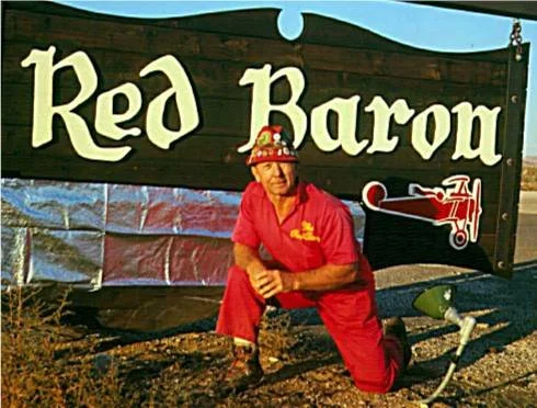 “Gram would roll in driving his pearl gray Aston-Martin followed by an entourage of six or seven fancy and exotic cars. A real ‘Grand Entrance’ at 3:00 in the afternoon in Yucca Valley at the Red Baron. The first couple of times he came in I didn’t even know who he was as he ordered pitchers of Margaritas for himself, this bright blonde headed guy and numerous other semi-famous rock stars and groupies that were with him. Gram always said he loved the Red Baron bar in the late afternoon with the windows facing the desert sunset.”