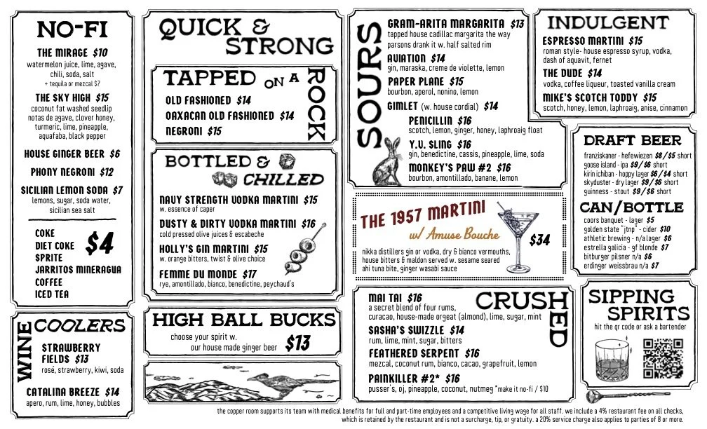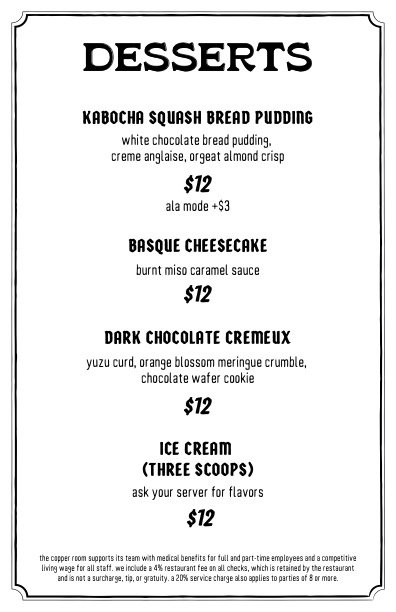 The Copper Room supports its team with medical benefits for full and part-time employees and a competitive living wage for all staff. We include a 4% restaurant fee on all checks, which is retained by the restaurant and is not a surcharge, tip, or gratuity.